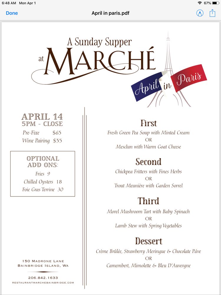 “ Weve been dining here for many years and still love it after a three year absence. Chef Greg and Betsey do an amazing job turning out excellent food and warm, friendly service. We ate here twice during our most recent stay on Bainbridge. First night we sat at the bar they were at full capacity and had a great meal of seared fresh wild salmon and mussels frites. Our server was warm and wonderful and we had a great chat with Betsey about their creative cocktail program. Chefs house made rolls with cultured butter is a must have here! They are warm and crusty and perfect. Everything he makes is great. There are no bad choices. So happy to see it thriving in this challenging time for the hospitality industry. Marche is a gem worth seeking out. ”